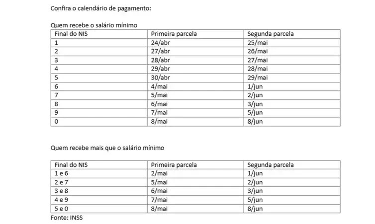 O benefício extra será pago em duas parcelas. A primeira será paga nesta sexta até 8 de maio. A segunda vai de 25 de maio a 8 de junho. As datas são definidas com base no dígito final do Número de Inscrição Social (NIS) e com base na renda do beneficiário. Quem ganha apenas o salário mínimo começa a receber antes de quem recebe mais que o mínimo.