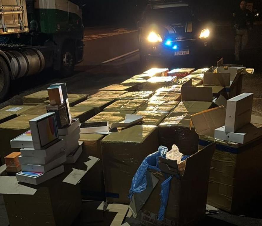 A Scania atrelada a um semirreboque graneleiro, ambos com placas de São Paulo, estava carregada com sucata, mas também levava 1.228 Iphones, 388 Macbooks, 30 Ipads, 404 smartphones Realme C75, 500 smartphones Readme 14C, 288 smartphones Poco, 77 relógios Garmim, quatro relógios Apple, 20 fones de ouvido Apple, 20 Tags Apple, 56 canetas Apple, caixas com perfumes diversos e duas caixas com equipamentos de informáticas diversos (memórias).