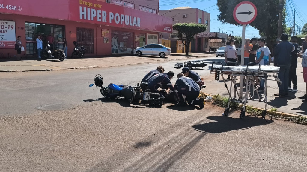 Três pessoas ficaram feridas em acidente envolvendo duas motos, ocorrido na manhã desta quarta-feira (22) no cruzamento das ruas Monte Alegre e Dom Pedro I, em Dourados.