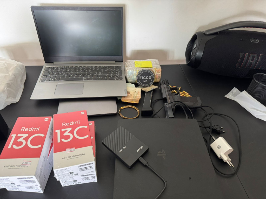 No decorrer da operação, foi cumprido mandado de busca e apreensão no endereço ligado ao investigado. Durante as buscas, as equipes localizaram grande quantidade de dinheiro em espécie (veja o vídeo abaixo), além de arma de fogo, munições, computadores, documentos e aparelhos celulares, materiais que indicam a atuação estruturada da organização criminosa.