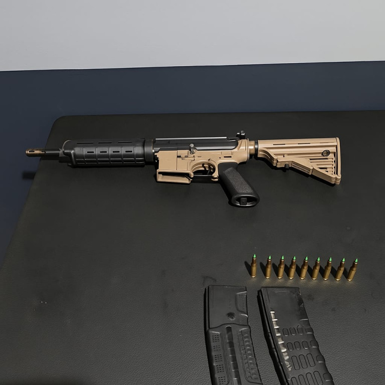 Durante as buscas, os policiais apreenderam um fuzil Colt M4 calibre 5,56, dois carregadores, um deles com dez munições, e uma pistola Taurus PT 840. O fuzil foi encontrado no quintal do vizinho, que acionou a equipe ao perceber a arma jogada.