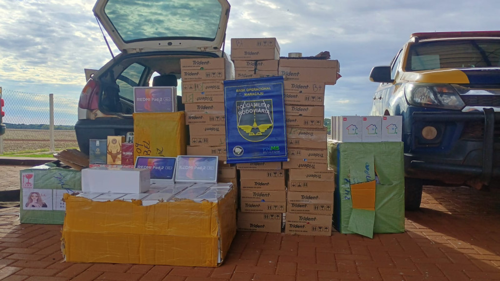 Em vistoria, os policiais constataram que o carro estava carregado com diversas mercadorias contrabandeadas do Paraguai. Entre os produtos apreendidos estavam 25 caixas de chicletes Trident, 17 aparelhos receptores de TV marca H8, cinco tablets Xiaomi Redmi Pad 2, quatro volumes de óculos e um volume de perfumes de marcas variadas.