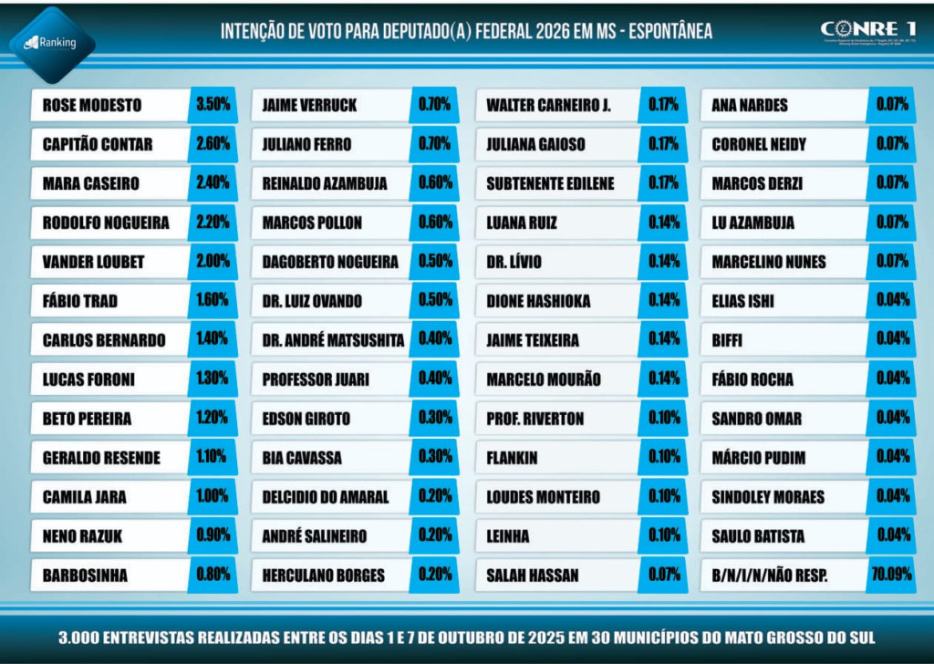 Por encomenda da Rede de Rádios Top FM, a segunda pesquisa realizada pelo Instituto Ranking Brasil Inteligência, de 1º a 7 de outubro deste ano, junto a 3 mil moradores com 16 anos ou mais, em 30 municípios de Mato Grosso do Sul, com intervalo de confiança de 95% e margem de erro de 1,8 ponto percentual para mais ou para menos, traz as intenções de votos para as oito vagas de deputados federais do estado.